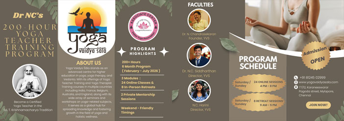 Yoga Vaidya Śāla welcomes all the students who are desirous in imbibing the higher nuances of Yoga and are committed to spread this Indian Vidyā System to our future generations in the Tradition of Patanjali, Śrī. Krishnamāchārya and Śrī. Desikachar.